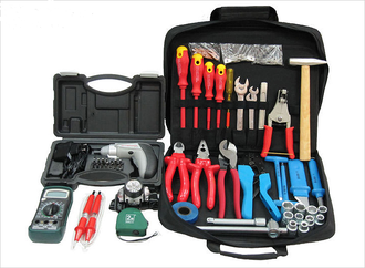 Данный набор инструментов включает в себя диэлектрические отвертки, плоскогубцы, кусачки, длинногубцы, кабелерез. Имеется возможность менять присоединительные клеммы на оборудовании, а наличие аккумуляторной отвертки с насадками позволяет ускорить сборочно-монтажный процесс.